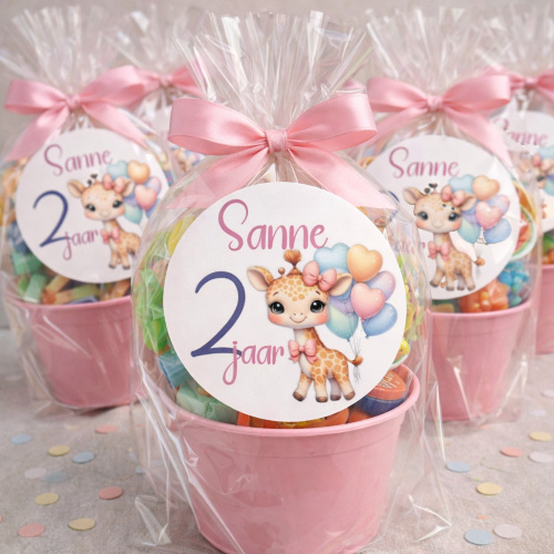 Traktatie stickers met naam en leeftijd, vrolijke stickers met een Baby giraf en ballonnen