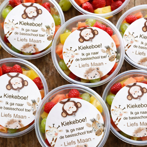 Traktatiestickers “Kiekeboe! Ik ga naar de basisschool toe” (doorsnee 4 cm)